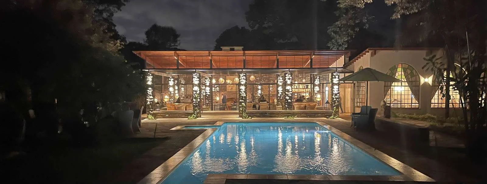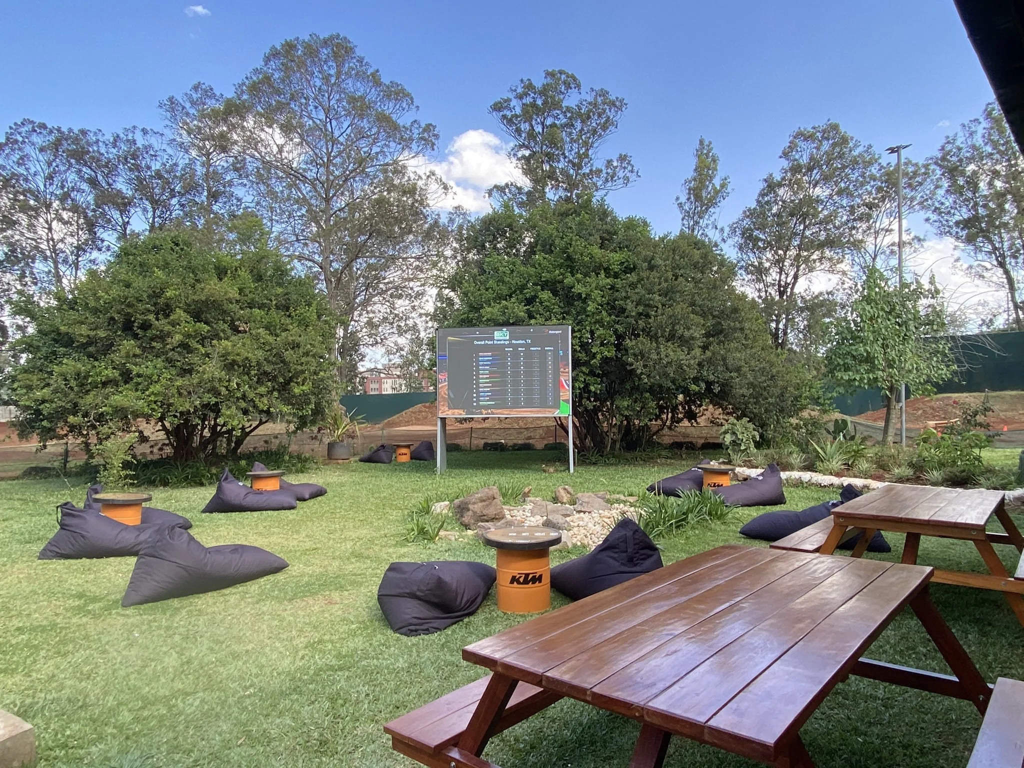 A classy lounge in garden setting with cocktails, indoor & outdoor seating